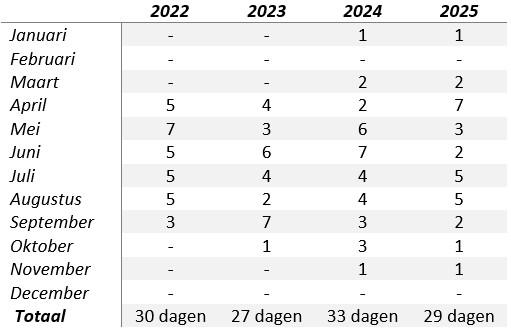 In de tabel hieronder staat het aantal dagen waarop één of meerdere bruinvissen zijn waargenomen en geïdentificeerd in de periode van begin 2022 t/m 2025. Het aantal dagen staat niet direct gelijk aan de onderzoeksinspanning. De uren die op een dag worden besteed aan het verzamelen van gegevens varieert namelijk. Gekeken naar het aantal uren onderzoeksinspanning ligt dit per jaar bij elkaar in de buurt.