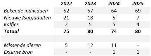 In 2022 en 2023 werden in vergelijking met 2024 en 2025 meer nieuwe (sub)adulte individuen gezien. Dit kan deels verklaard worden door de beperkte onderzoeksinspanning in 2021, waardoor individuen die voor 2022 al aanwezig waren pas in 2022 en 2023 voor het eerst door ons werden waargenomen.